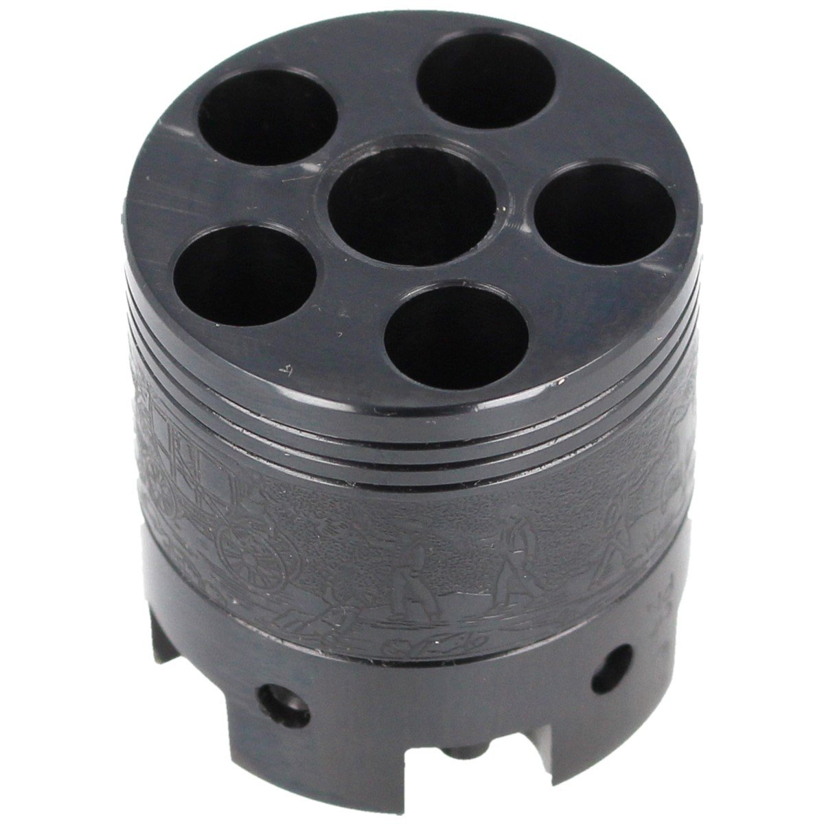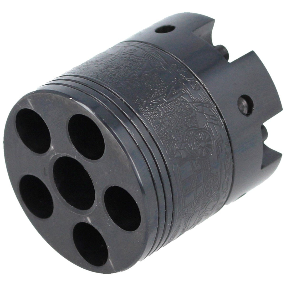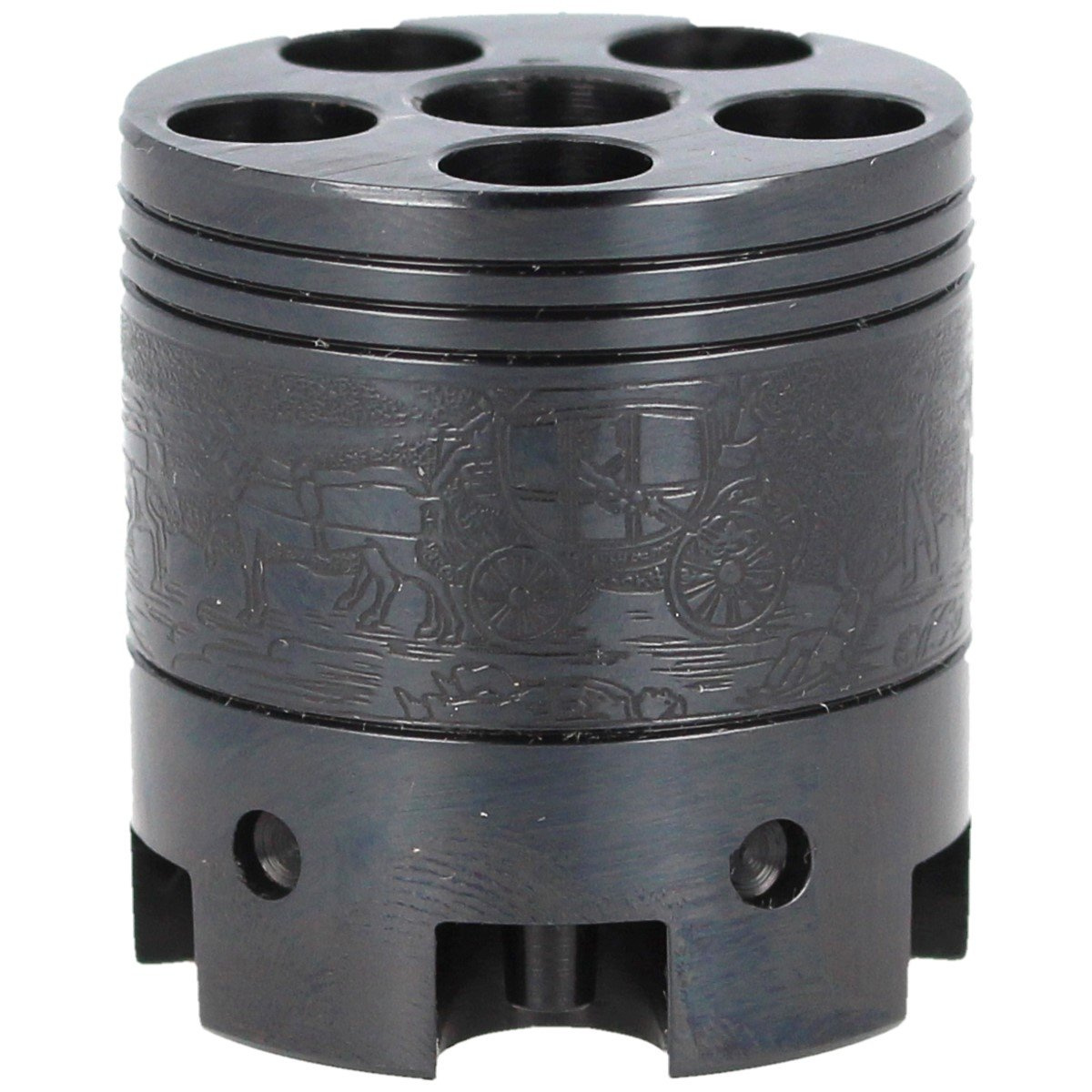 - A2092 pełny 5-cio komorowy bęben kapiszonowy firmy Pietta przeznaczony do rewolweru czarnoprochowego 1836 Colt Paterson Texas w kal. .36. Oksydowany na czarno z wygrawerowaną na cylindrze bębna sceną napadu na dyliżans. W zestawie komplet 5-ciu kominków.