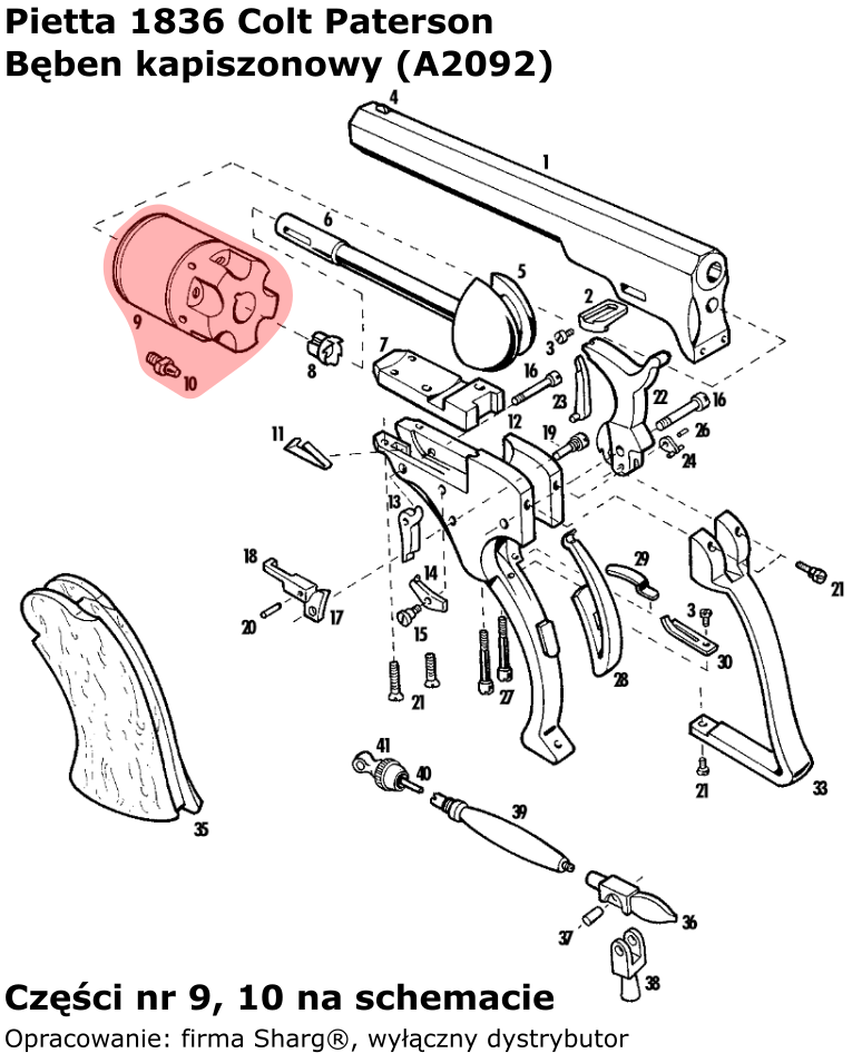 A2092 5-cio komorowy pełny bęben kapiszonowy (#9 na schemacie) firmy Pietta z kompletem kominków (#10). Oksydowany na czarno z wygrawerowaną na cylindrze bębna sceną napadu na dyliżans. Przeznaczony do rewolweru czarnoprochowego 1836 Colt Paterson Texas w kalibrze .36.